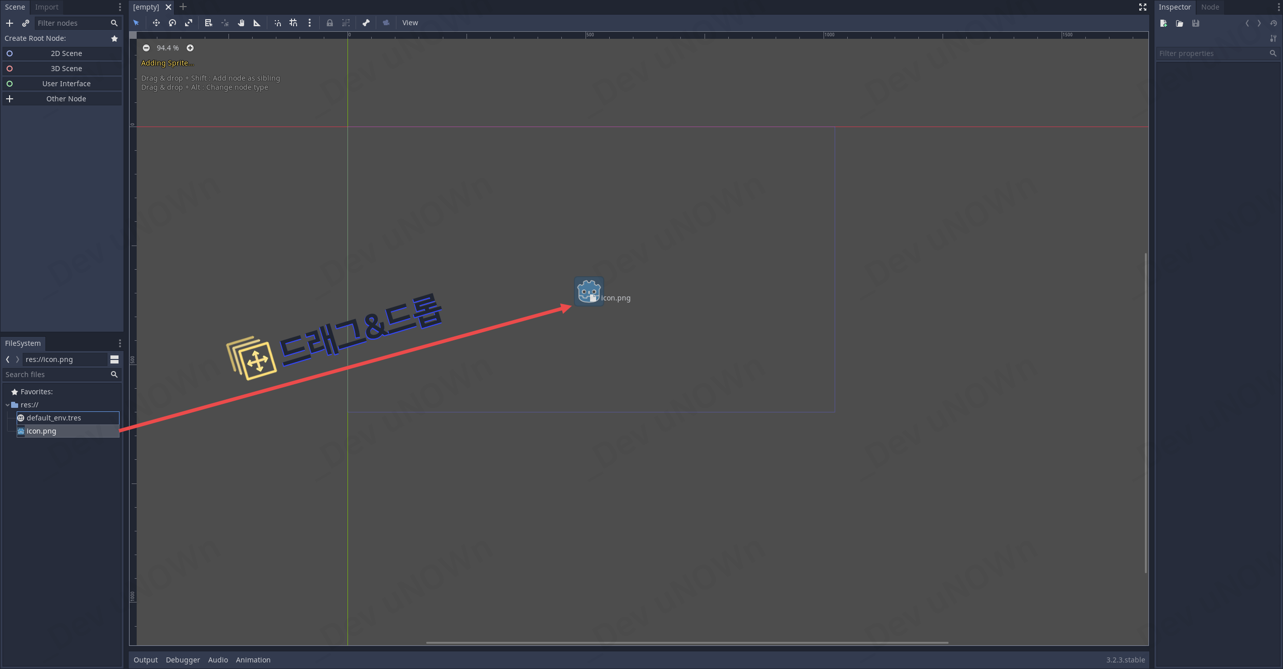 다음과 같이 드래그&드롭으로 에디터의 2D 작업 공간(2D workspace)에 배치를 해줍시다.