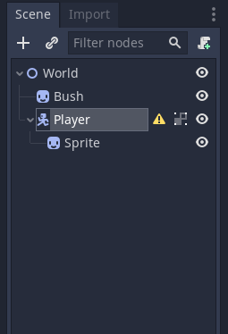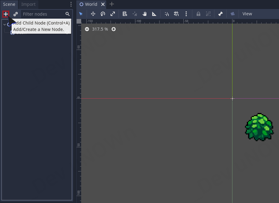 우선 노드를 하나 생성해봅시다. 씬(Scene) 뷰에 배치되는 오브젝트는 노드라는 이름을 가지고 있습니다.