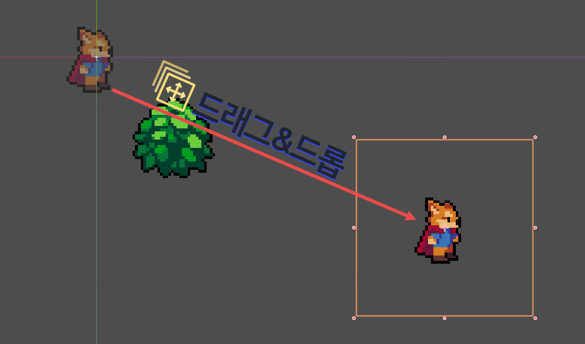 지금 보시는 바와 같이 선택하고 드래그&드롭을 하게 되면 스프라이트가 선택돼서 옮겨졌음을 알 수 있습니다.