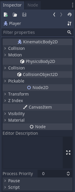 KinematicBody2D: 충돌체(Collisions)를 가지고 있고 코드로 움직임을 제어하는 물체에 쓰임