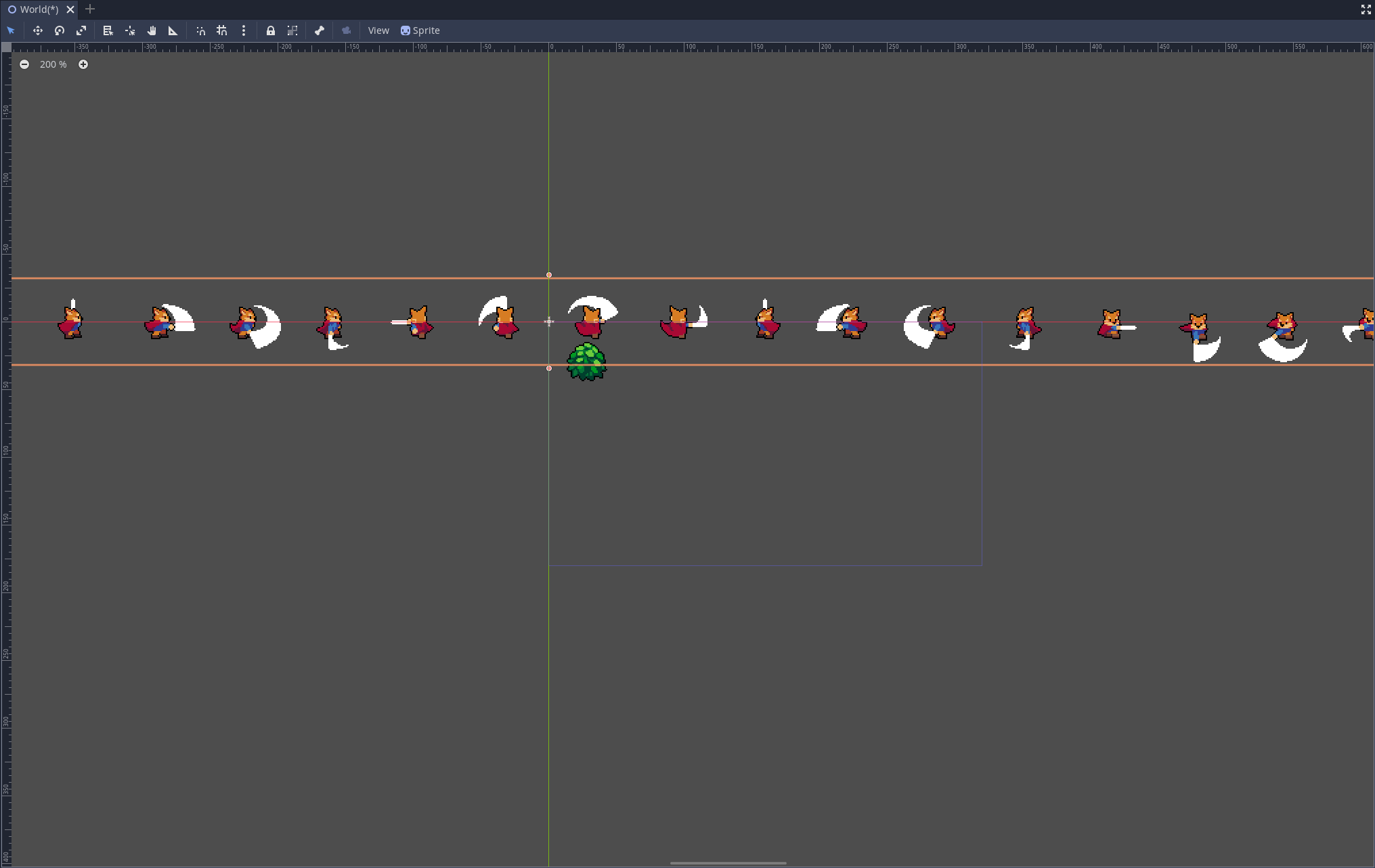 여우 캐릭터의 가운데 위치하고 있는 십자 표시는 피벗을 가리킵니다. 이 경우 스프라이트의 피벗라고 말할 수 있죠.