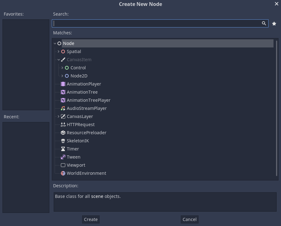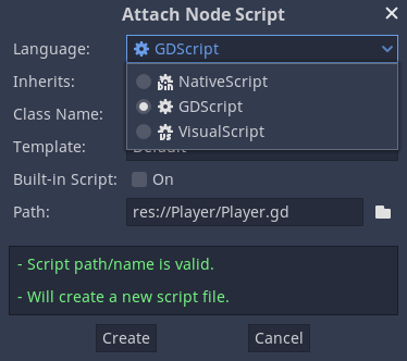 여기서 우리는 'KinematicBody2D'를 사용할 것입니다. 클릭하시고 아래 'Create'를 눌러주세요.