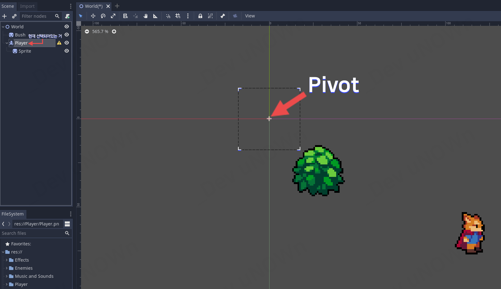 현재 Player가 선택되어 있죠? 아까 전에 우리는 스프라이트 위치를 옮겼습니다. 하지만 이렇게 되면
