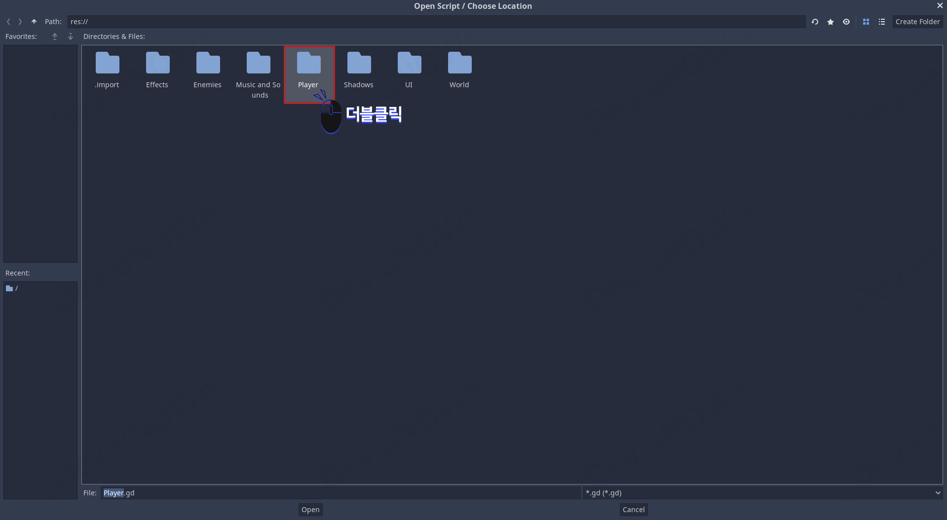 새로 열리는 창에서 Player 폴더 더블 클릭해서 들어간 다음 'Open'