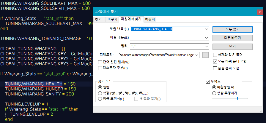 이 부분은 'TUNING.WHARANG_HEALTH'를 Notepad++의 기능인 파일 내 찾기(Ctrl+Shift+F)로 추적해보면