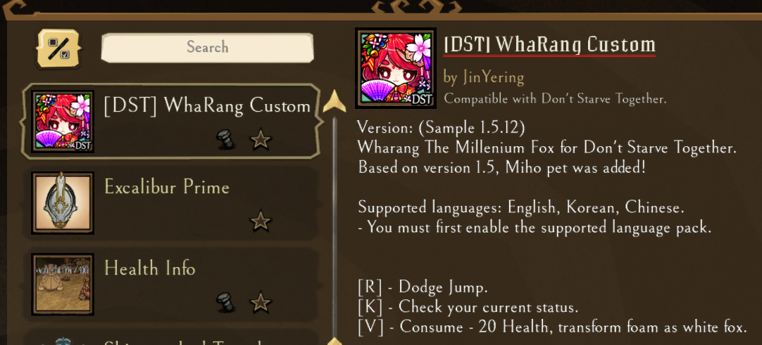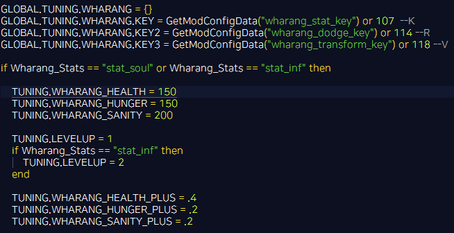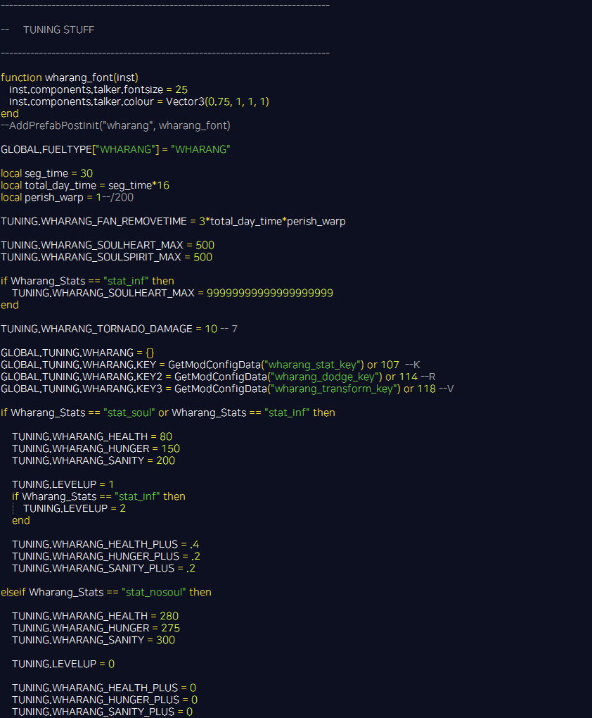이렇게 선언된 변수들은 차후 게임에서 `(backtick)키를 통해 콘솔 창을 연 뒤 'print(TUNING.WHARANG_HEALTH)'를