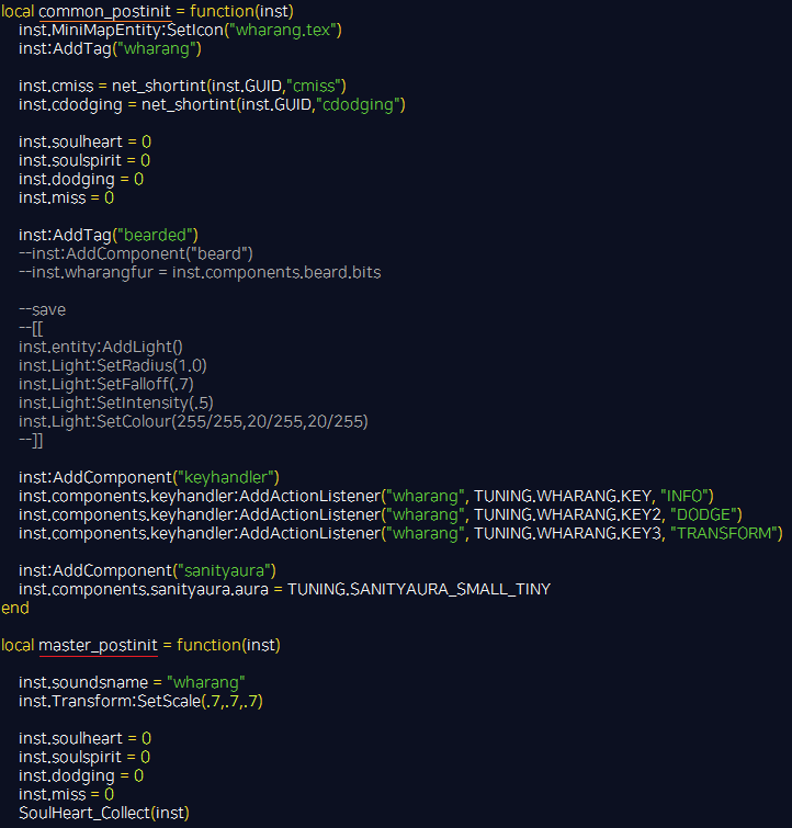 여기서 wharang이 캐릭터 명이므로 'scripts\prefabs\wharang.lua'가 되겠네요. 다른 캐릭터 또한 이 부분에서
