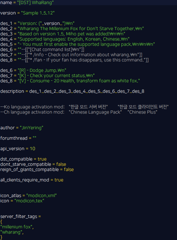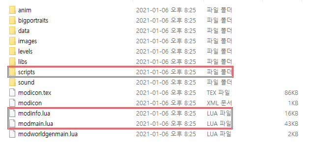 modinfo.lua: 모드의 정보가 들어 있습니다. 예를 들어 이름, 버전명 등이 있죠