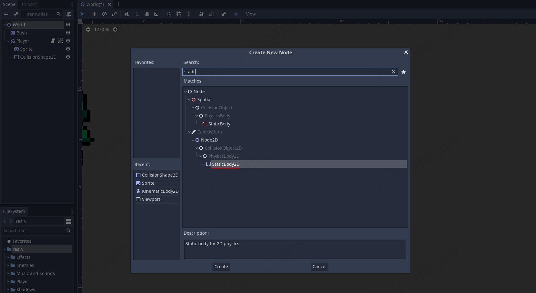 다시 노드를 추가합니다. Search란에 'Static'를 입력하고 보이는 StaticBody2D를 선택합니다.