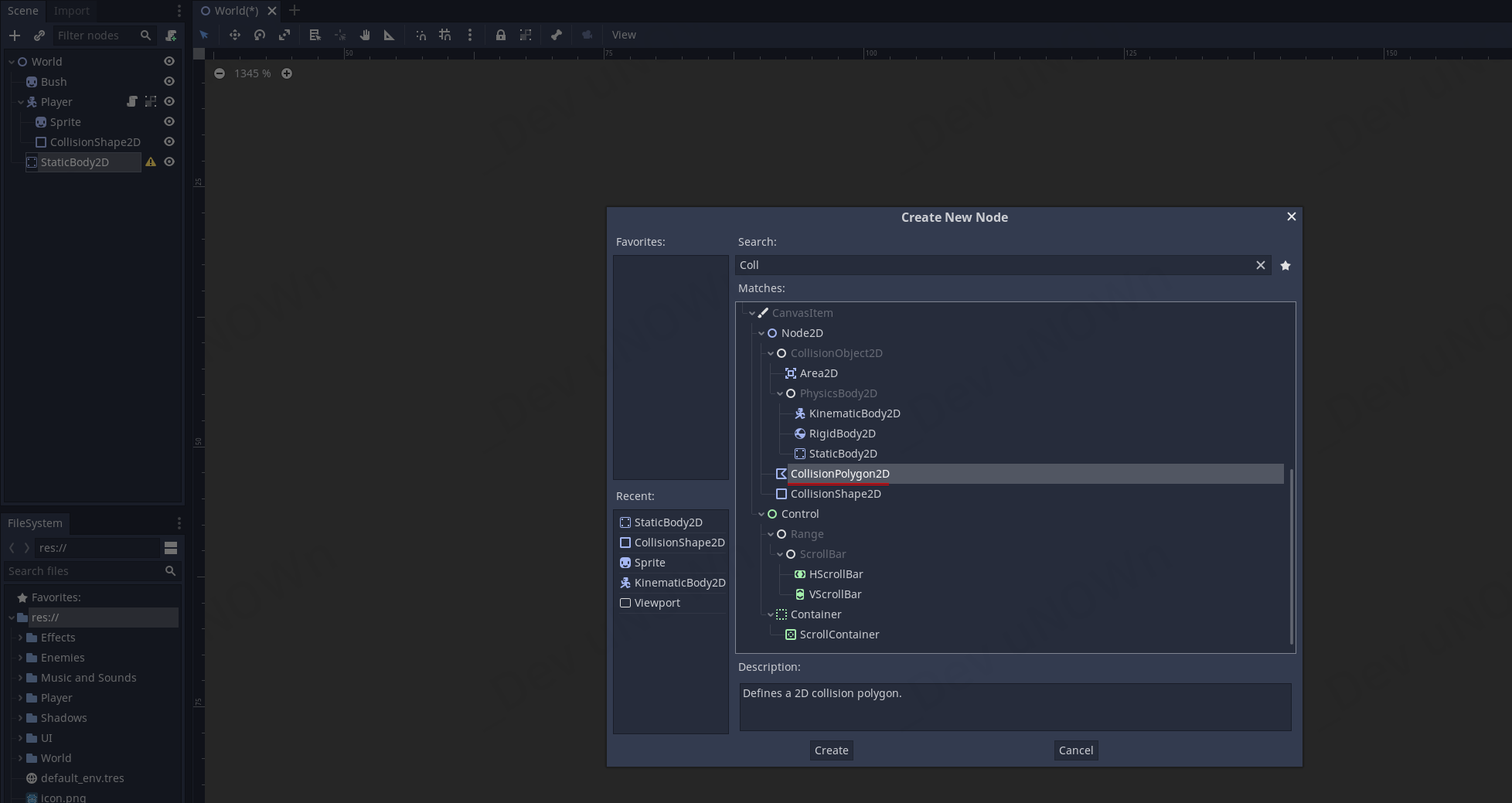 Search란에 'Coll'를 입력하고 보이는 CollisionPolygon2D를 선택합니다.