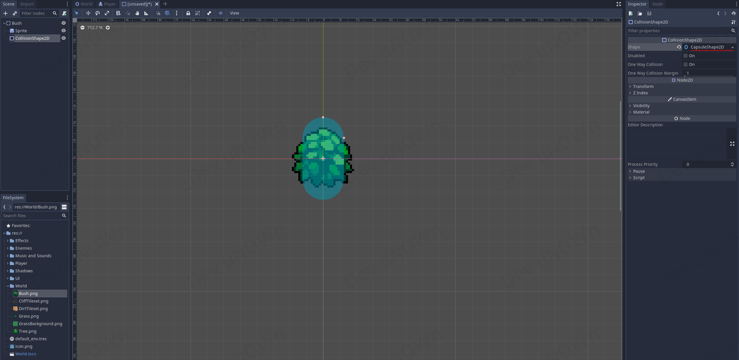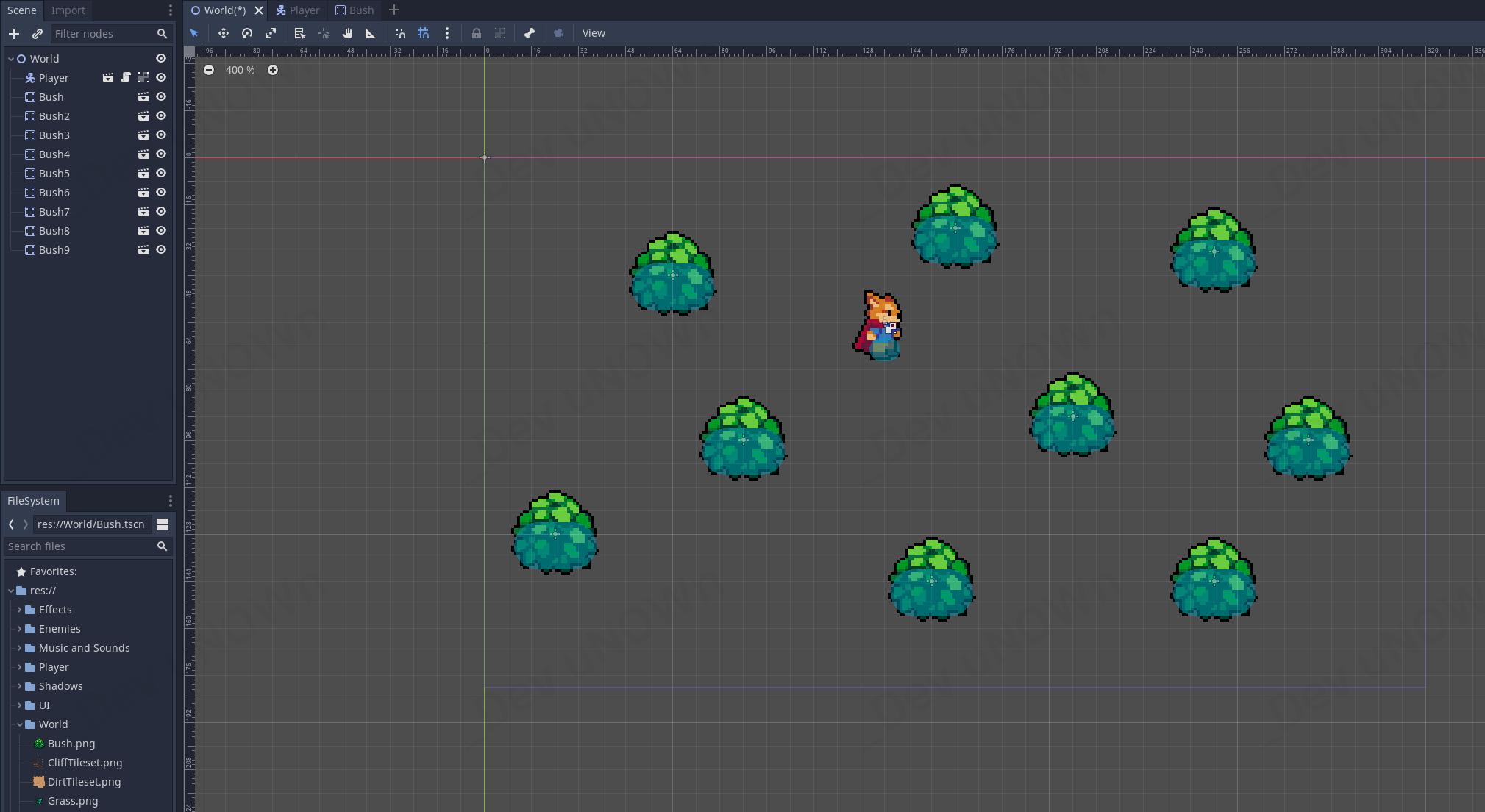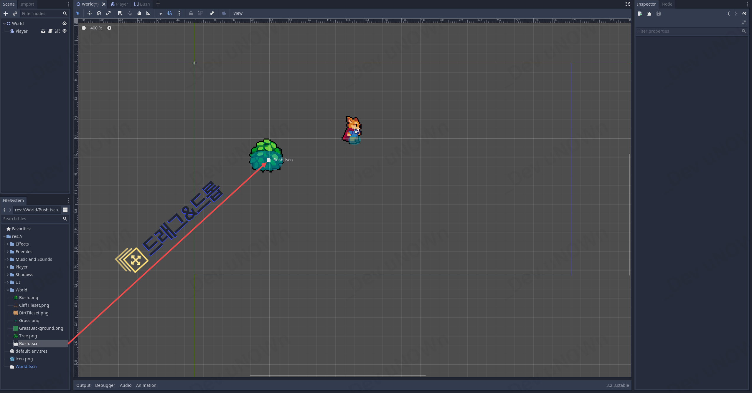 World 폴더에 저장해둔 Bush.tscn를 꺼내서 배치해 봅시다.
