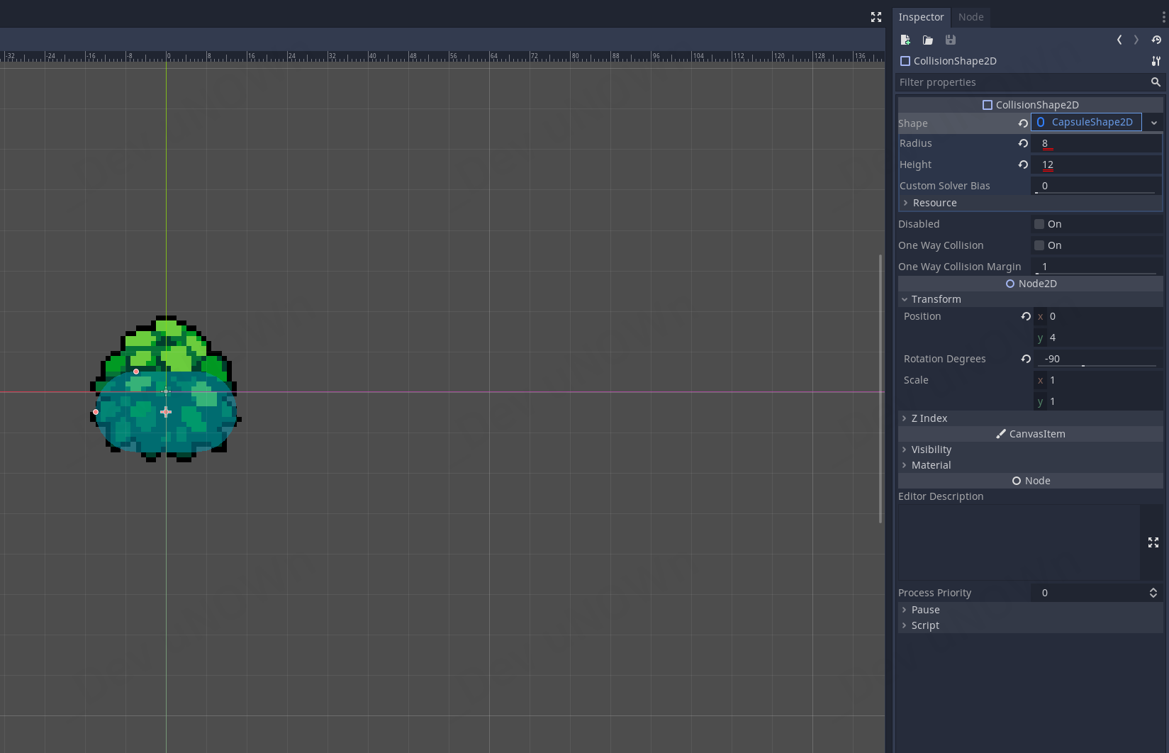 캐릭터의 콜리전 쉐이프2D를 다음과 같이 수정합니다. CapsuleShape2D를 클릭하면 해당 옵션이 나옵니다.