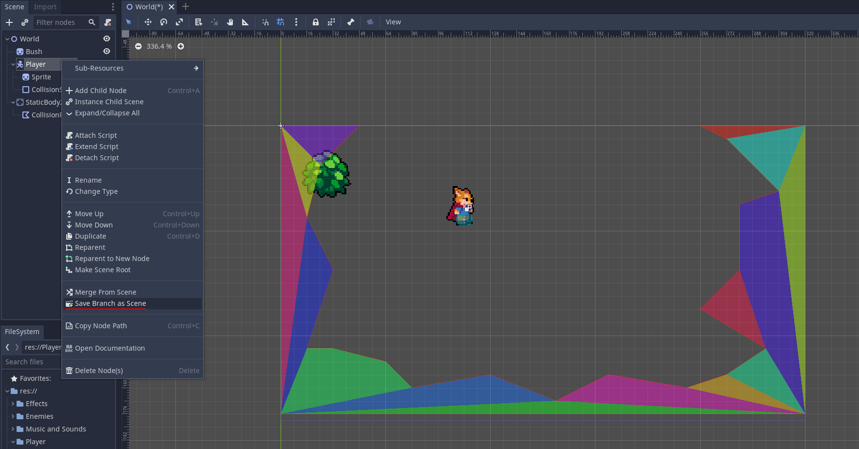 Player노드를 우클릭해서 Save Branch as Scene를 눌러주도록 합니다.