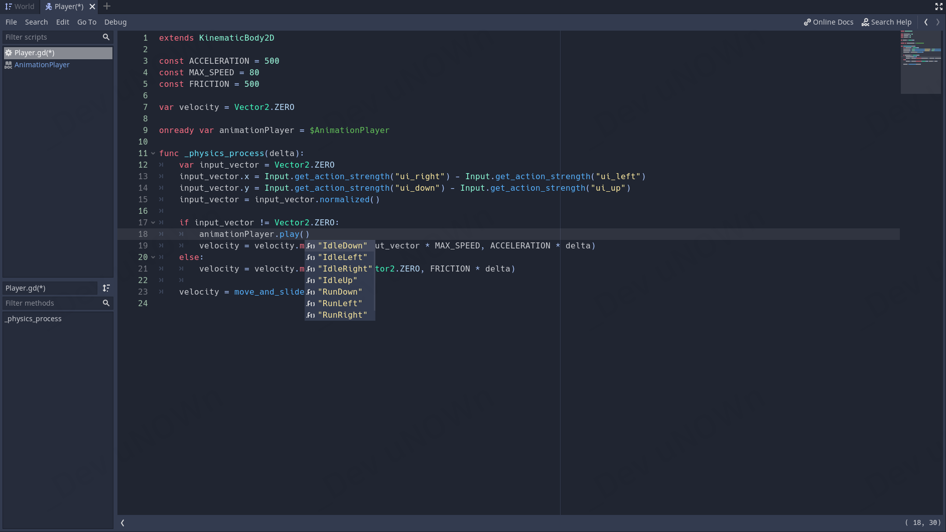 아마 'play('를 입력하는 도중에 위의 이미지처럼 떴을 것입니다. 여기서 "RunRight"를 선택해 주세요.