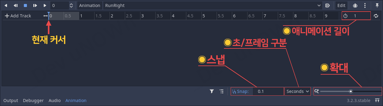 여기서 타임라인에 있는 커서를 0.1로 옮겨주세요.