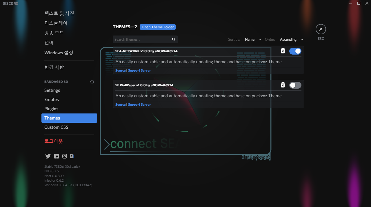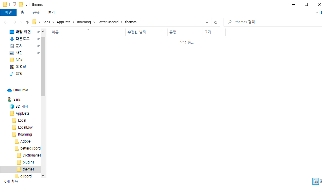 열린 윈도우 탐색기 창에서 테마를 넣어야 합니다. 하지만 Better Discord를 깐다고 기본 테마를 제공하진 않습니다.