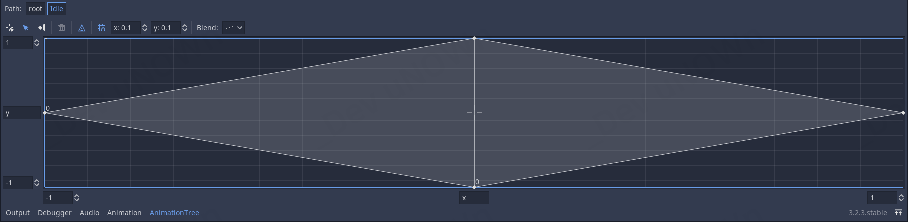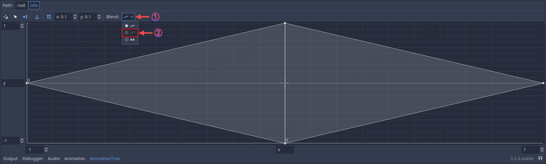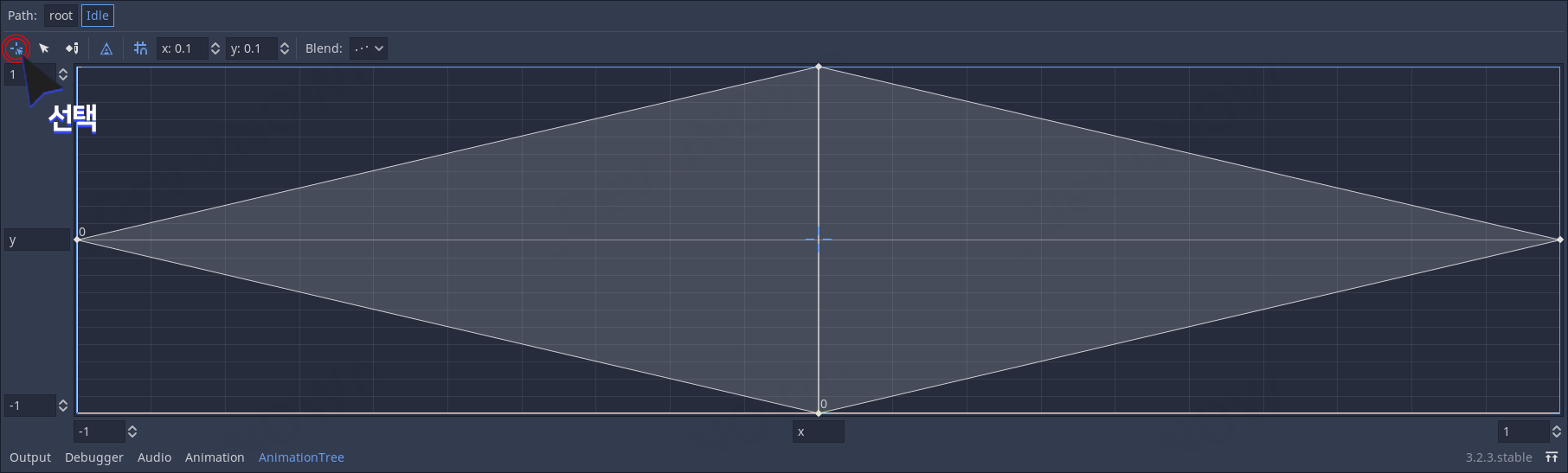 AnimationTree 노드를 선택한 상태에서 Idle - Blend Position에 마우스를 대면 다음과 같이 경로가 보입니다.