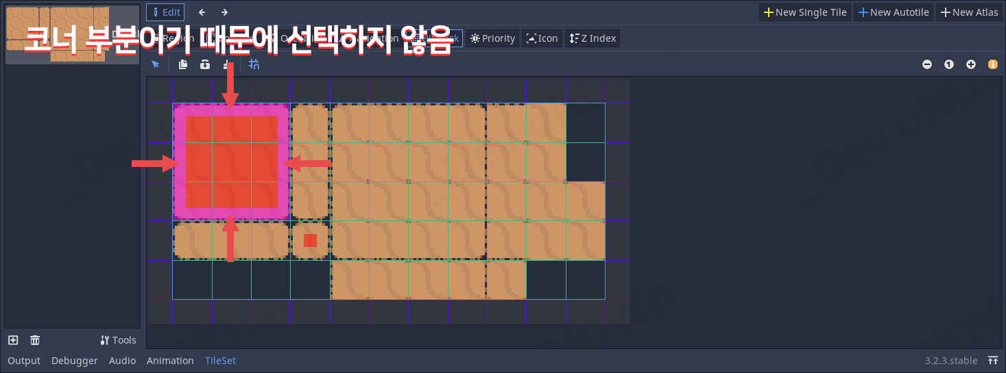 그럼 이제 3x3 중심 타일은 다 선택하는데 외곽 타일에서 코너 부분은