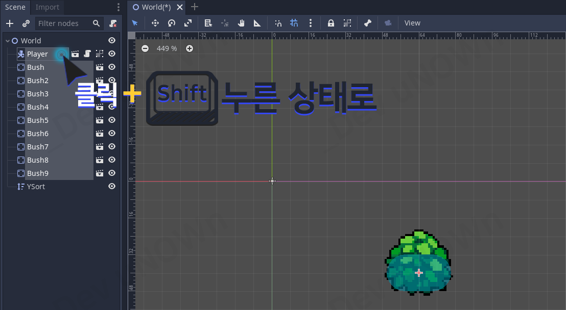 선택을 하셨으면 그 상태로 Shift를 누르고 최상위 노드 World 아래에 있는 Player 노드를 선택합니다.