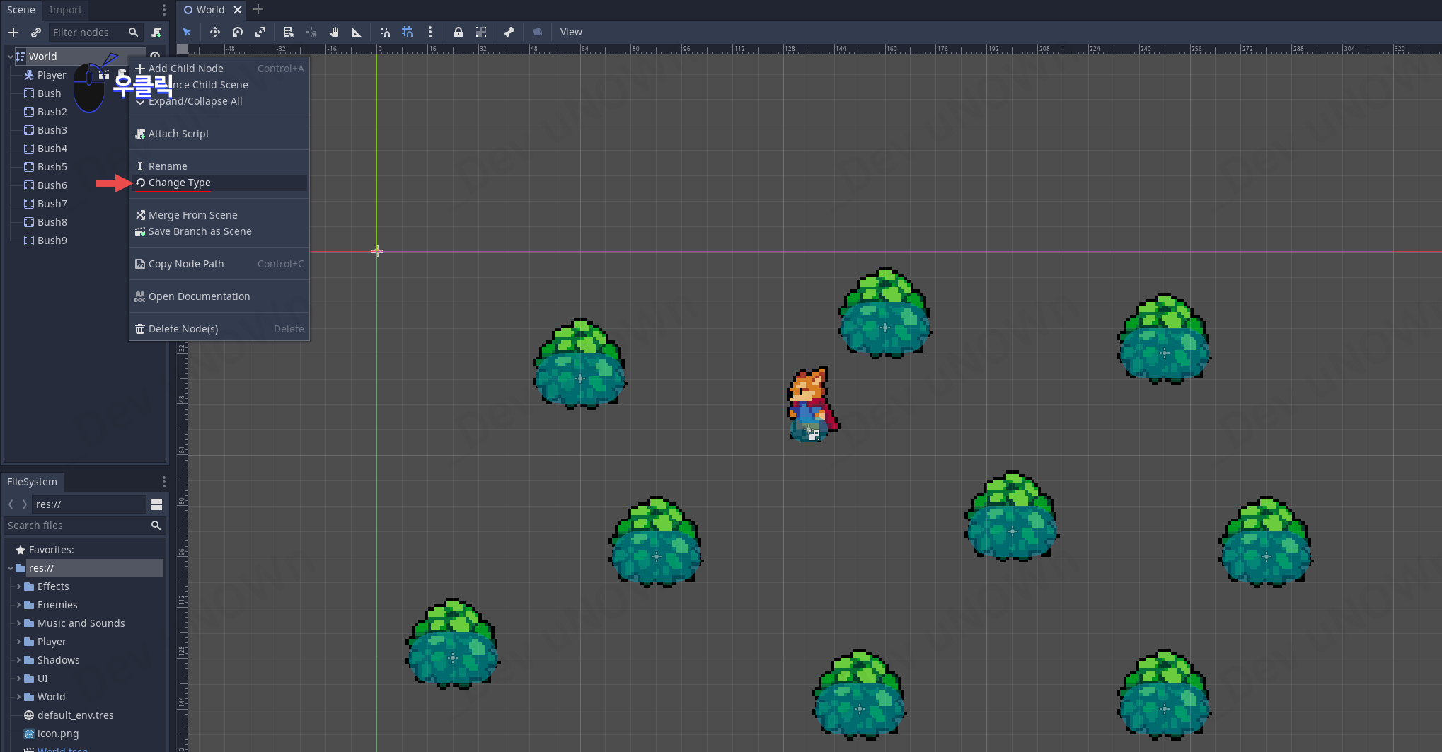 World노드를 우클릭해서 Change Type를 선택합니다.