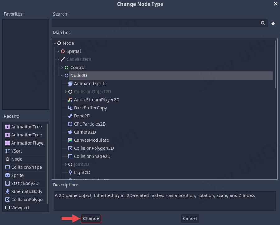 원래 유형이었던 Node2D로 변경하도록 하겠습니다. 선택하고 Change를 눌러 변경합니다.