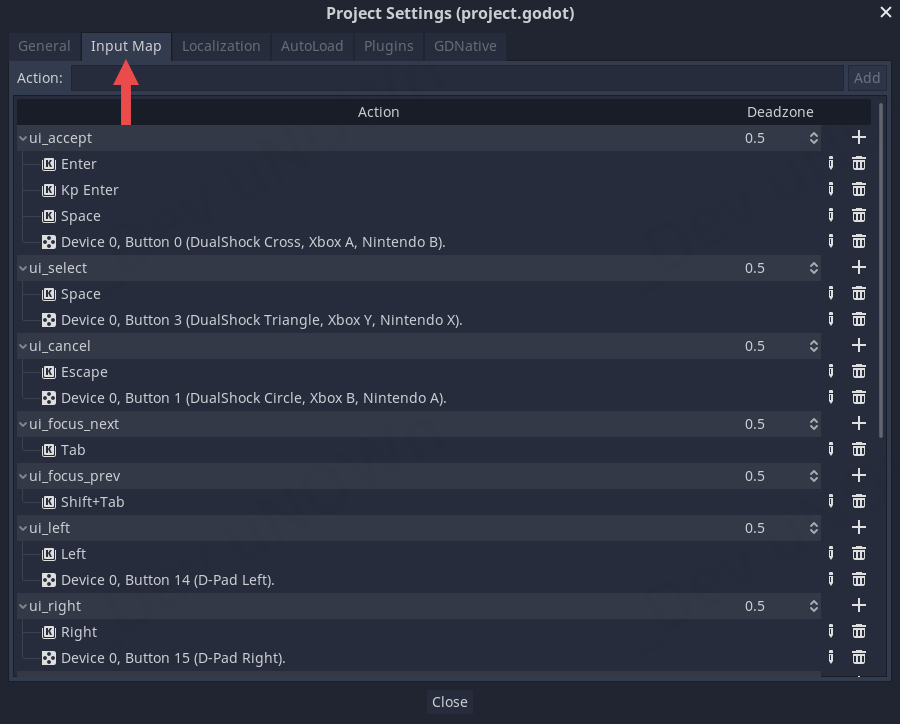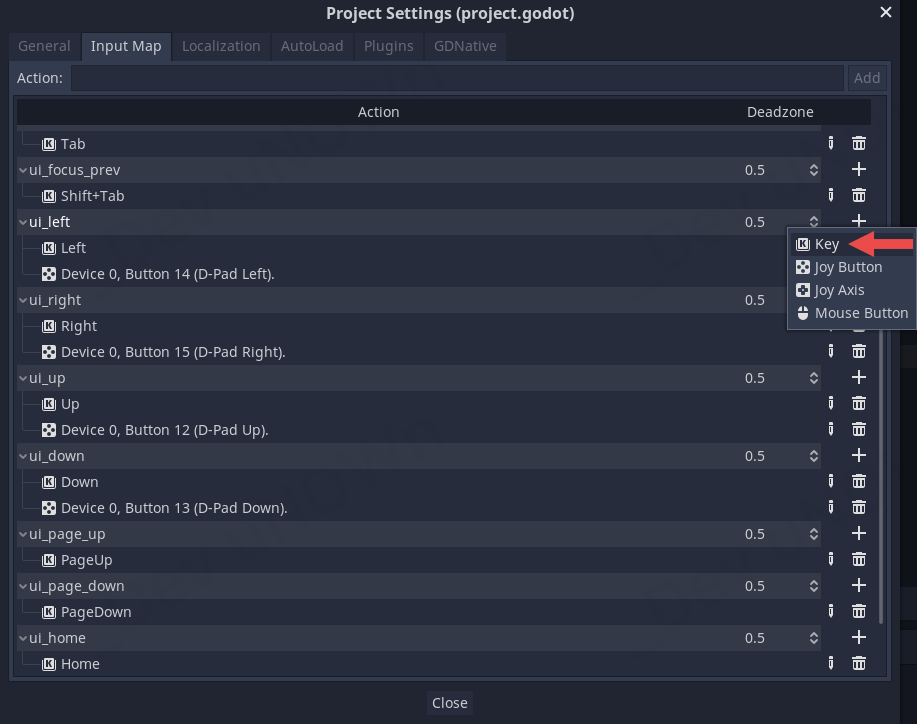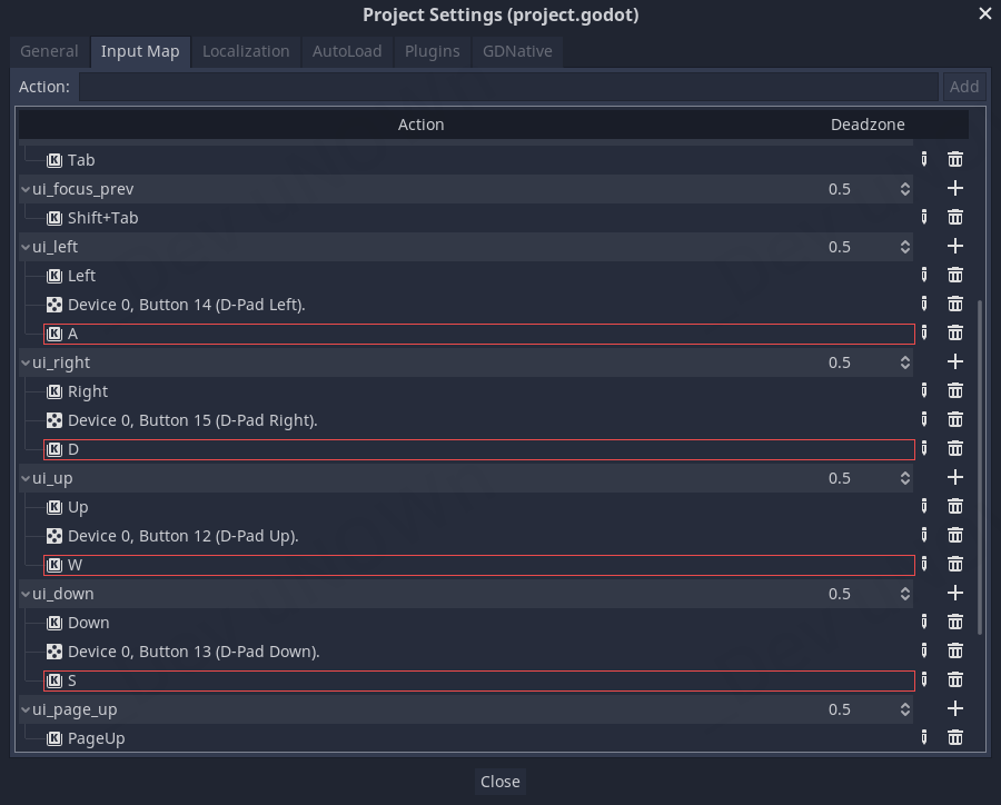 그 밑에 있는 ui_right, ui_up, ui_down 항목에 각각 D, W, S키를 추가합니다.