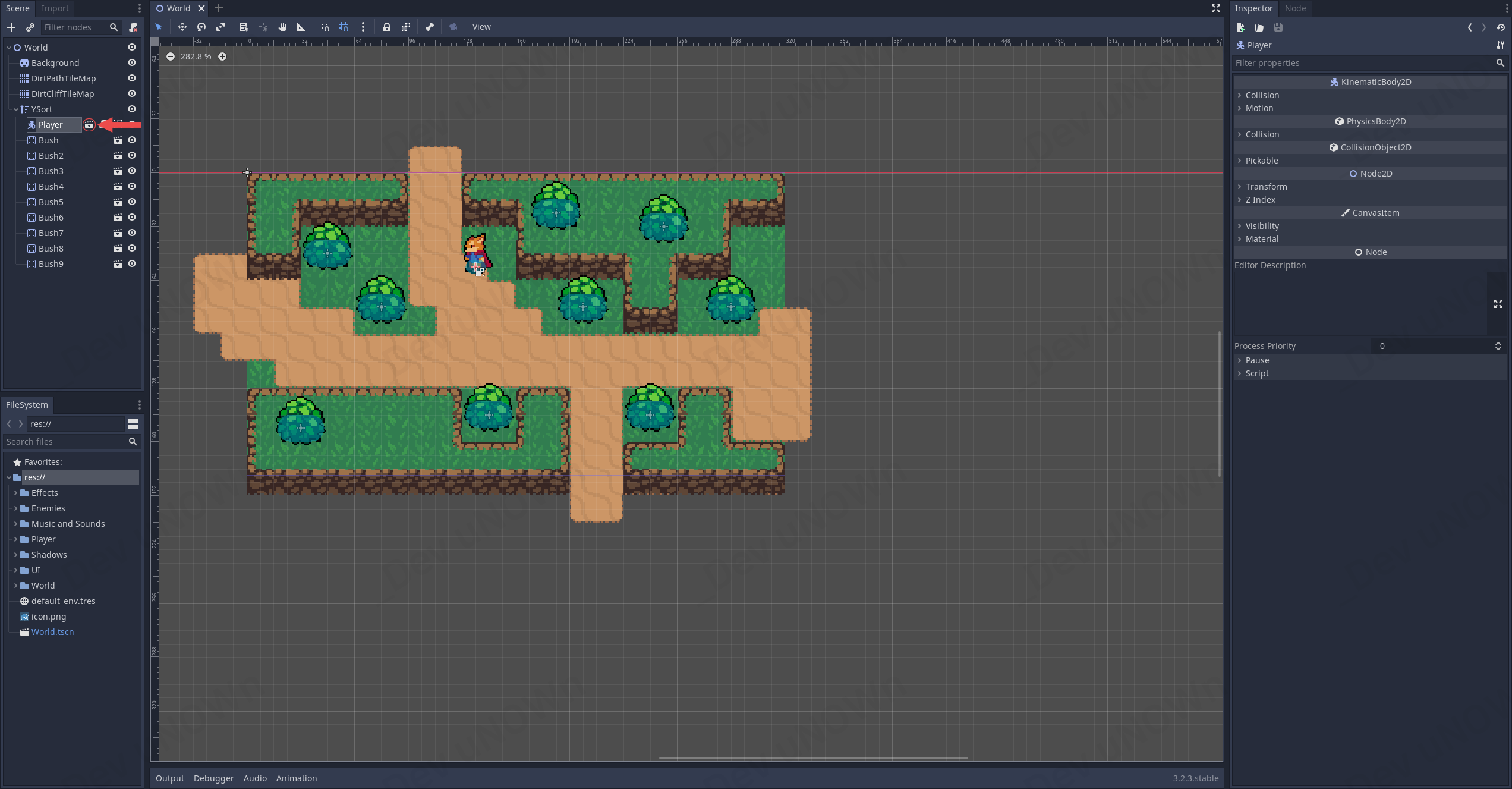 다시 2D 작업공간(2D workspace)으로 돌아옵니다. 그다음에 AnimationPlayer를 선택합니다.
