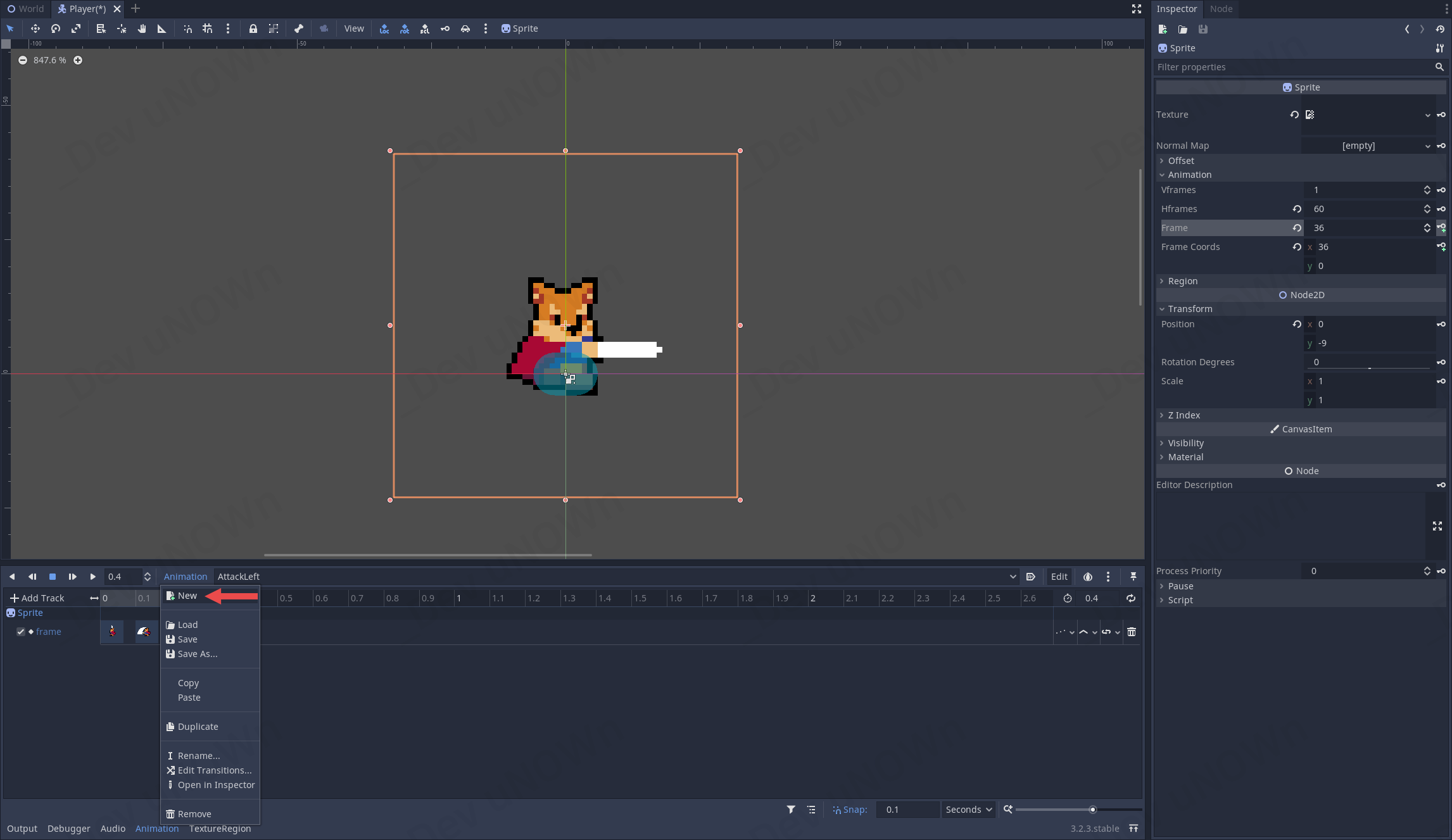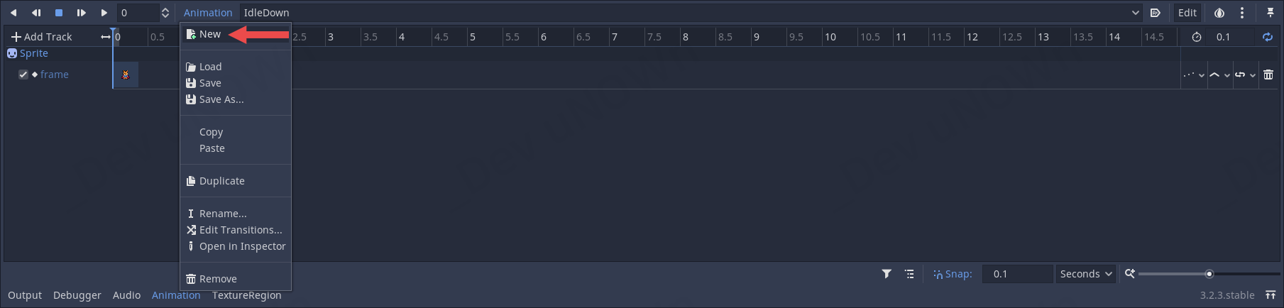 Animation 버튼을 눌러 New를 선택합니다.
