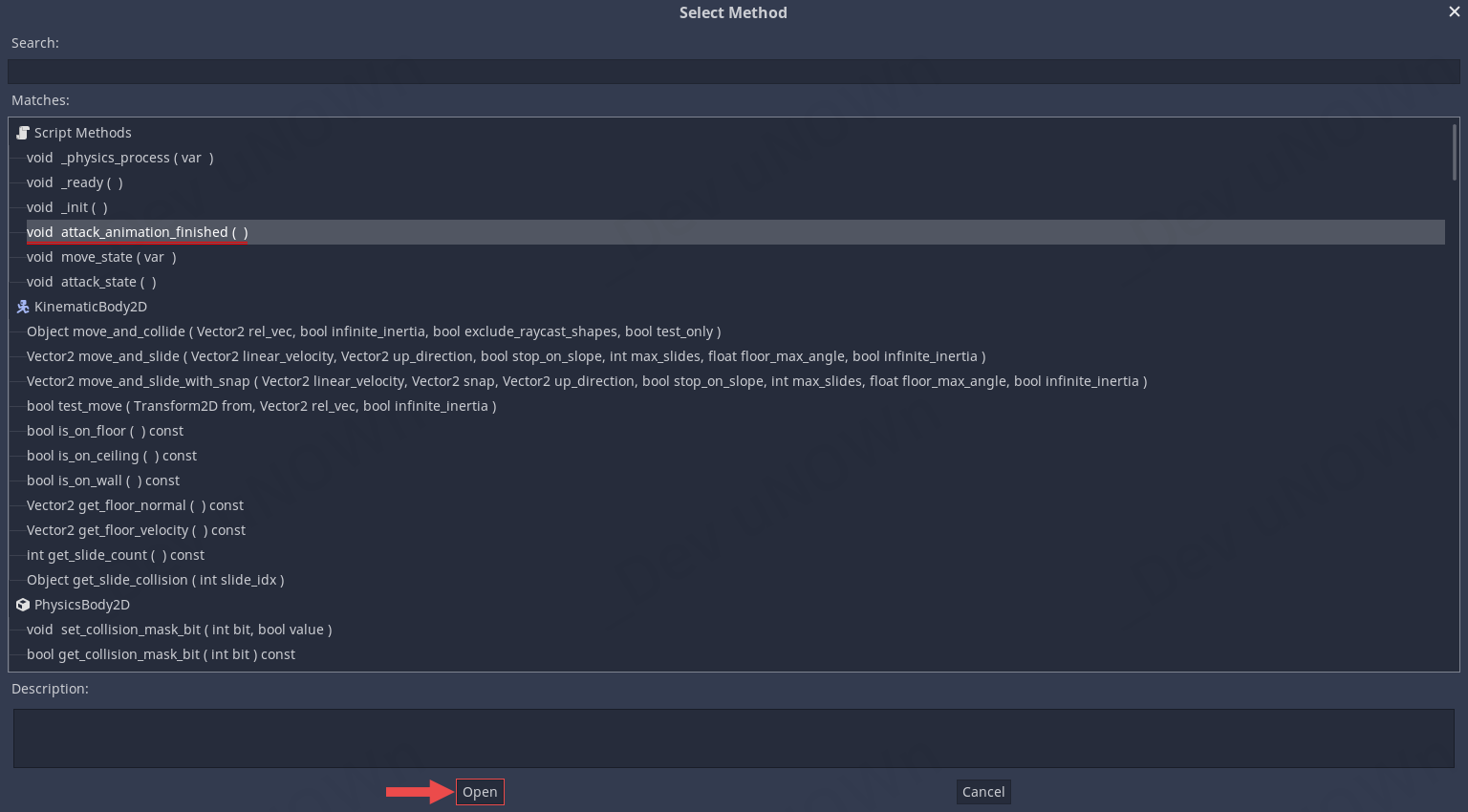 방금 작성한 코드의 함수 attack_animation_finished()를 선택하고 Open 버튼을 클릭합니다.