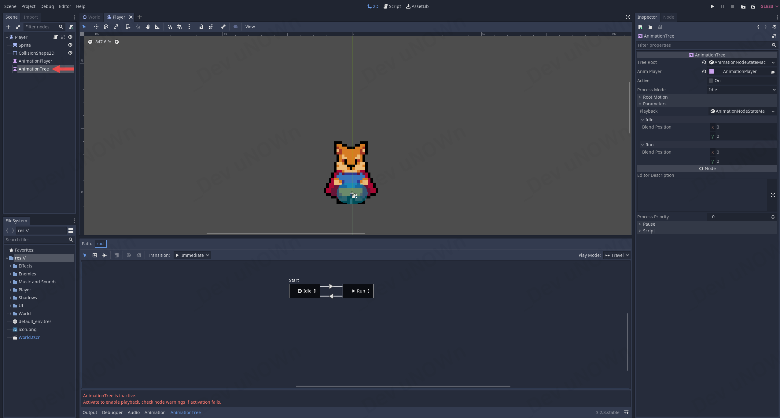 다시 2D 작업공간으로 돌아온 다음, AnimationTree를 선택합니다.