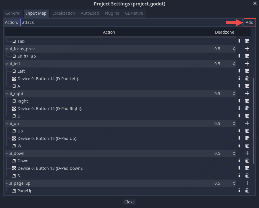 액션을 추가하기 위해 Action:에 'attack'을 입력하고 Add버튼을 눌러 추가합니다.