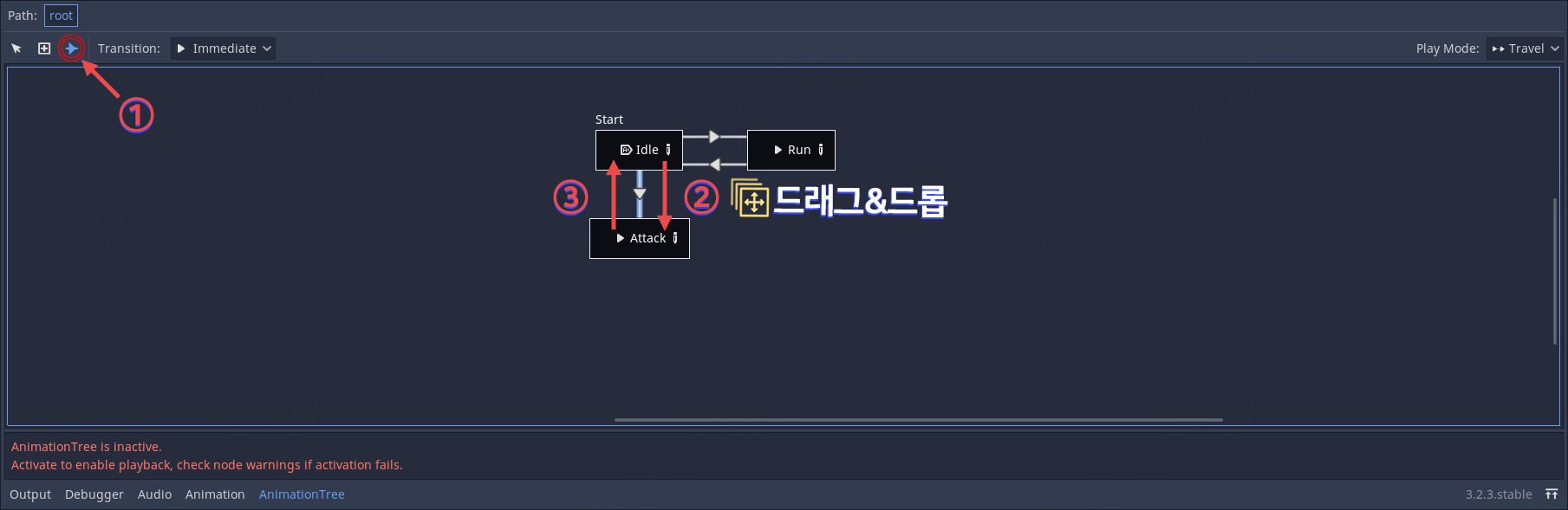 노드 연결 아이콘을 클릭해 Idle → Attack으로 드래그&드롭
