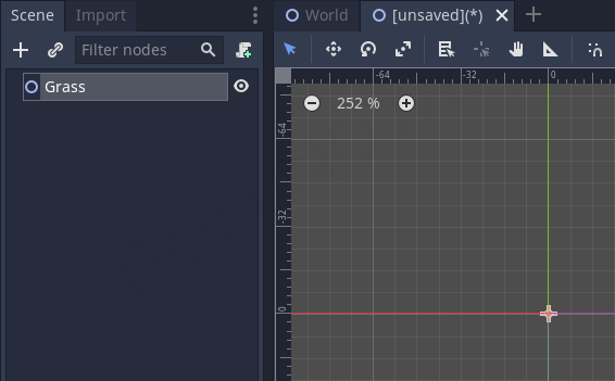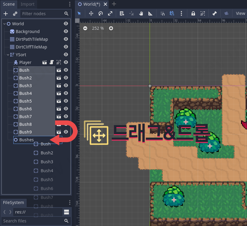 Grass.tscn를 2D 작업공간에 배치해보도록 하겠습니다. 적당히 꾸미고 싶은 곳에 배치해주세요.