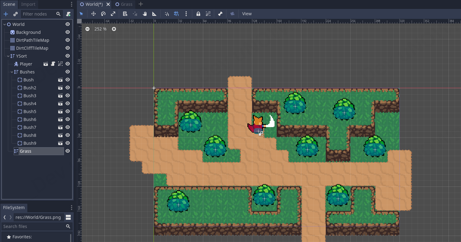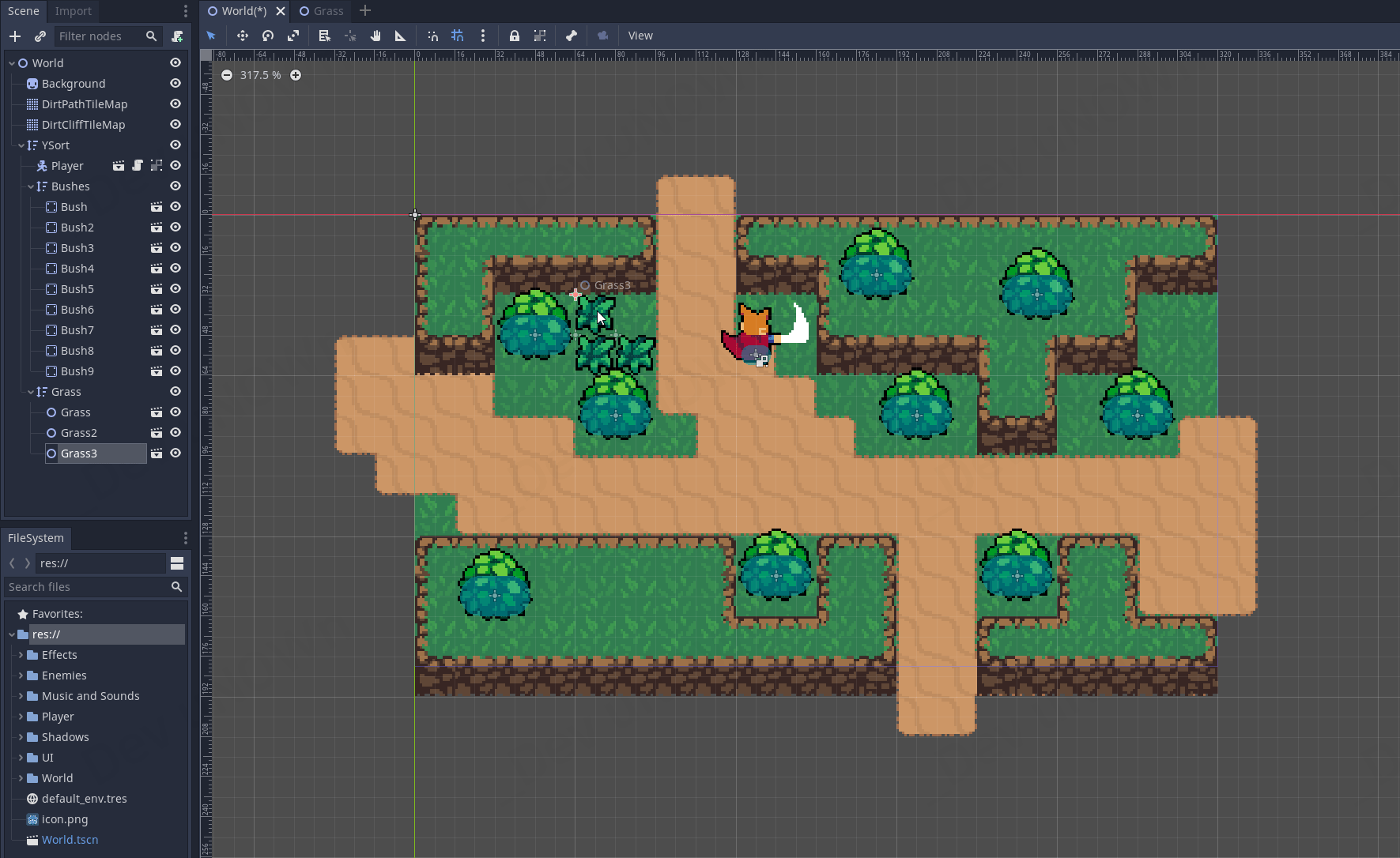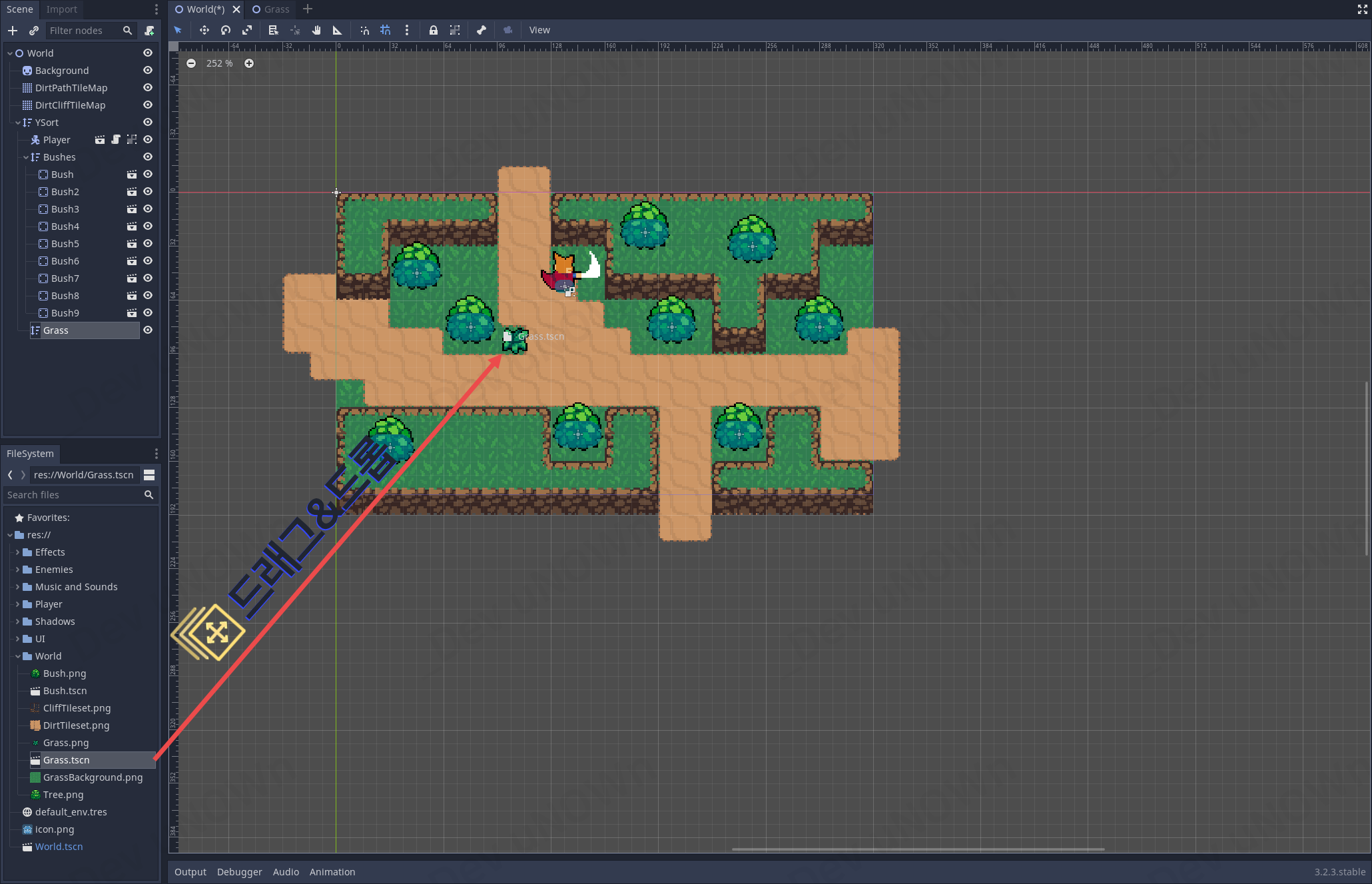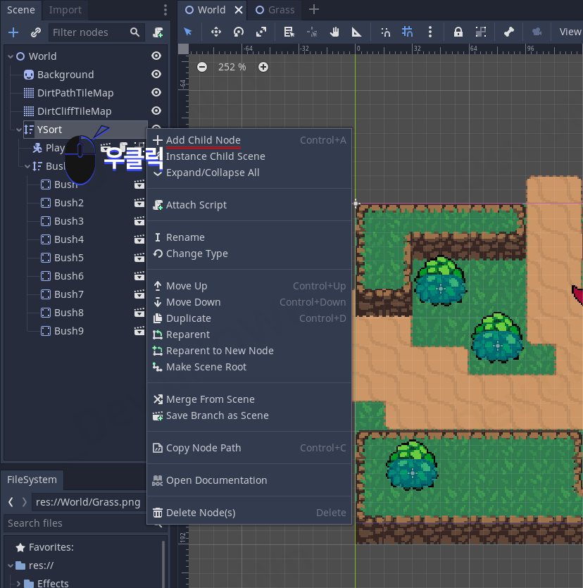 만약에 Grass 씬을 닫아놓으셨다면 파일 시스템에서 World - Grass.tscn를 클릭해서 여시면 됩니다.