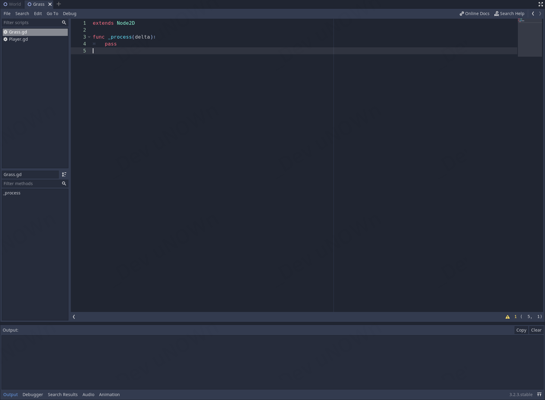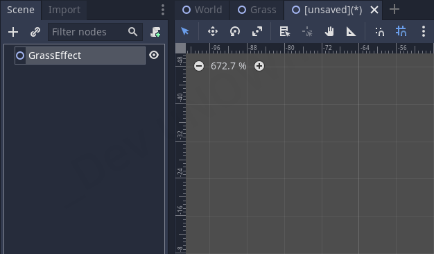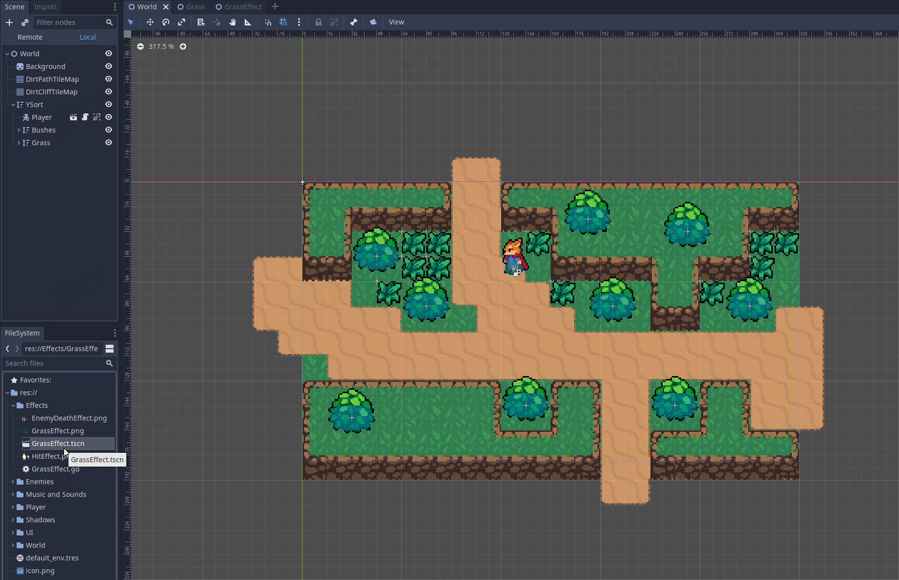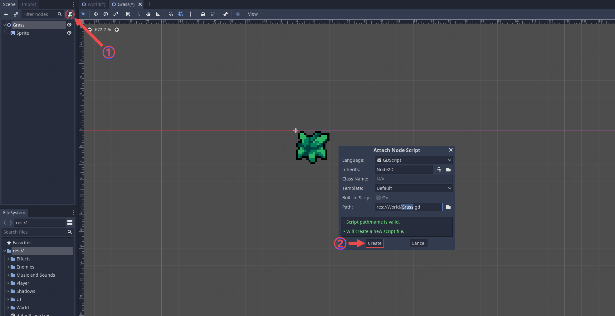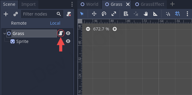 만약에 Grass 씬을 닫아놓으셨다면 파일 시스템에서 World - Grass.tscn를 클릭해서 여시면 됩니다.