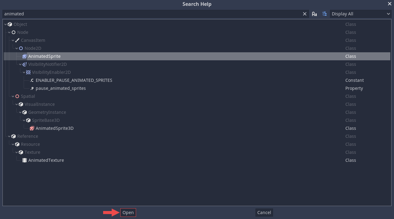 'animated'라고 검색 한 뒤 보이는 AnimatedSprite를 선택해서 열어봅시다.