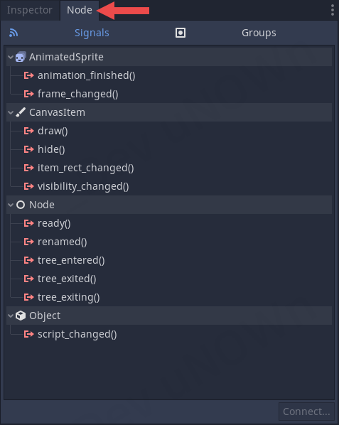 우측 인스펙터 뷰 옆에 있는 Node 탭을 클릭합니다.