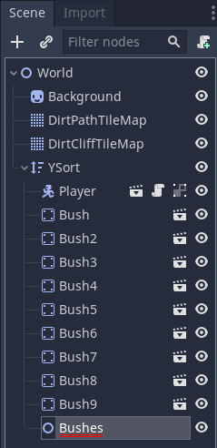 World 씬(Scene)에서 가장 먼저 Bush들을 그룹화하는 작업을 거치도록 하겠습니다.