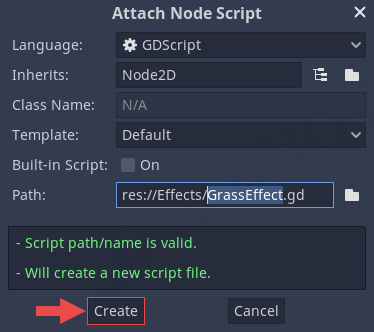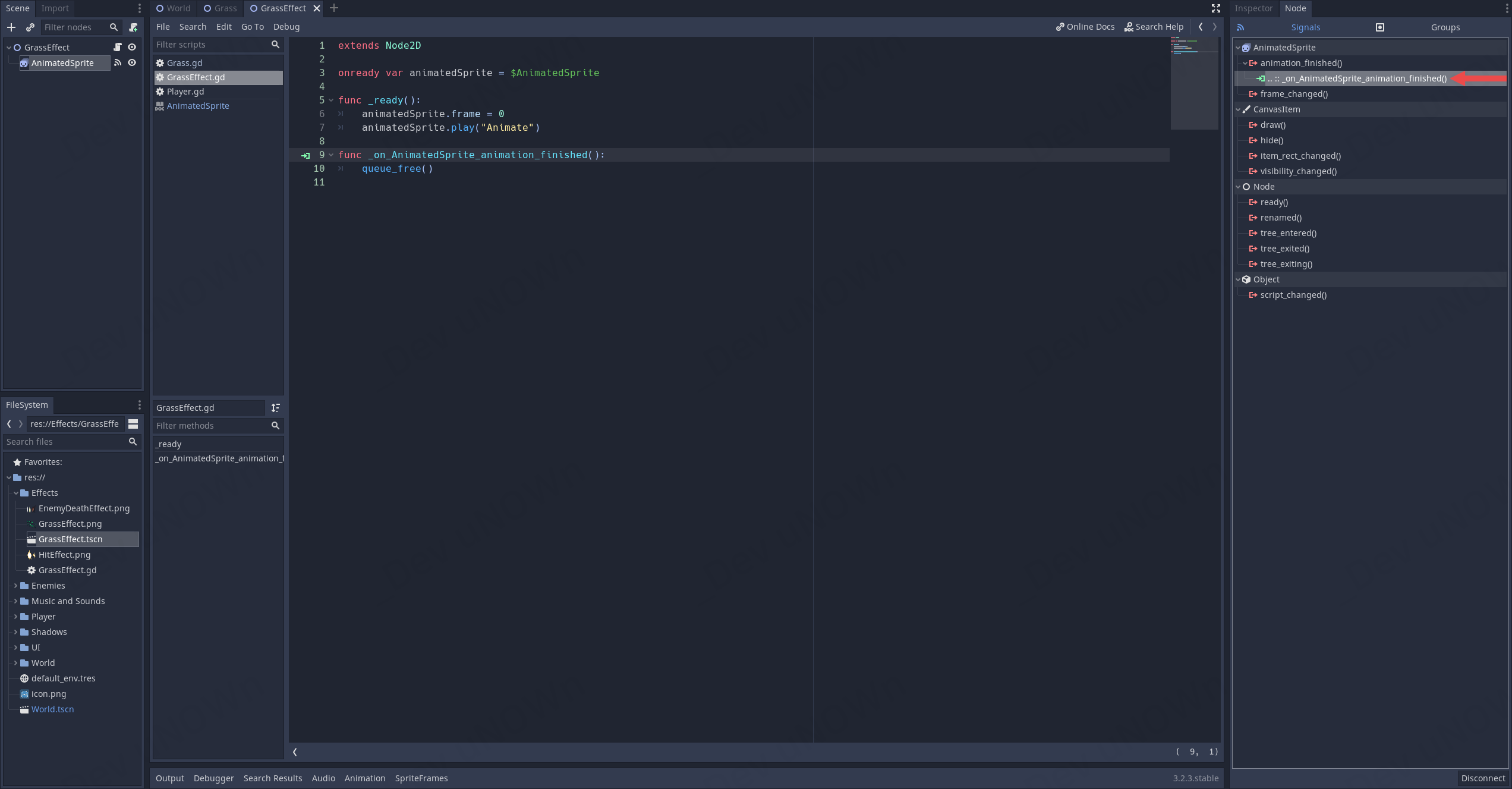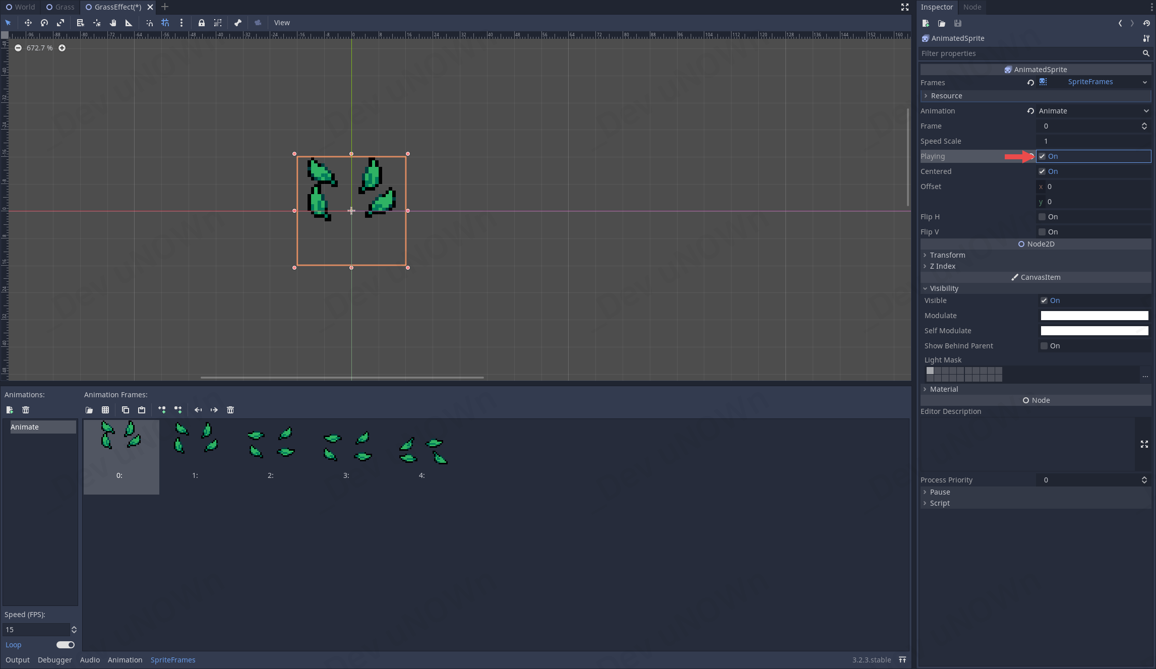 변수grassEffect의 위치, global.position을 Grass 노드의 global.position으로 변경합니다.