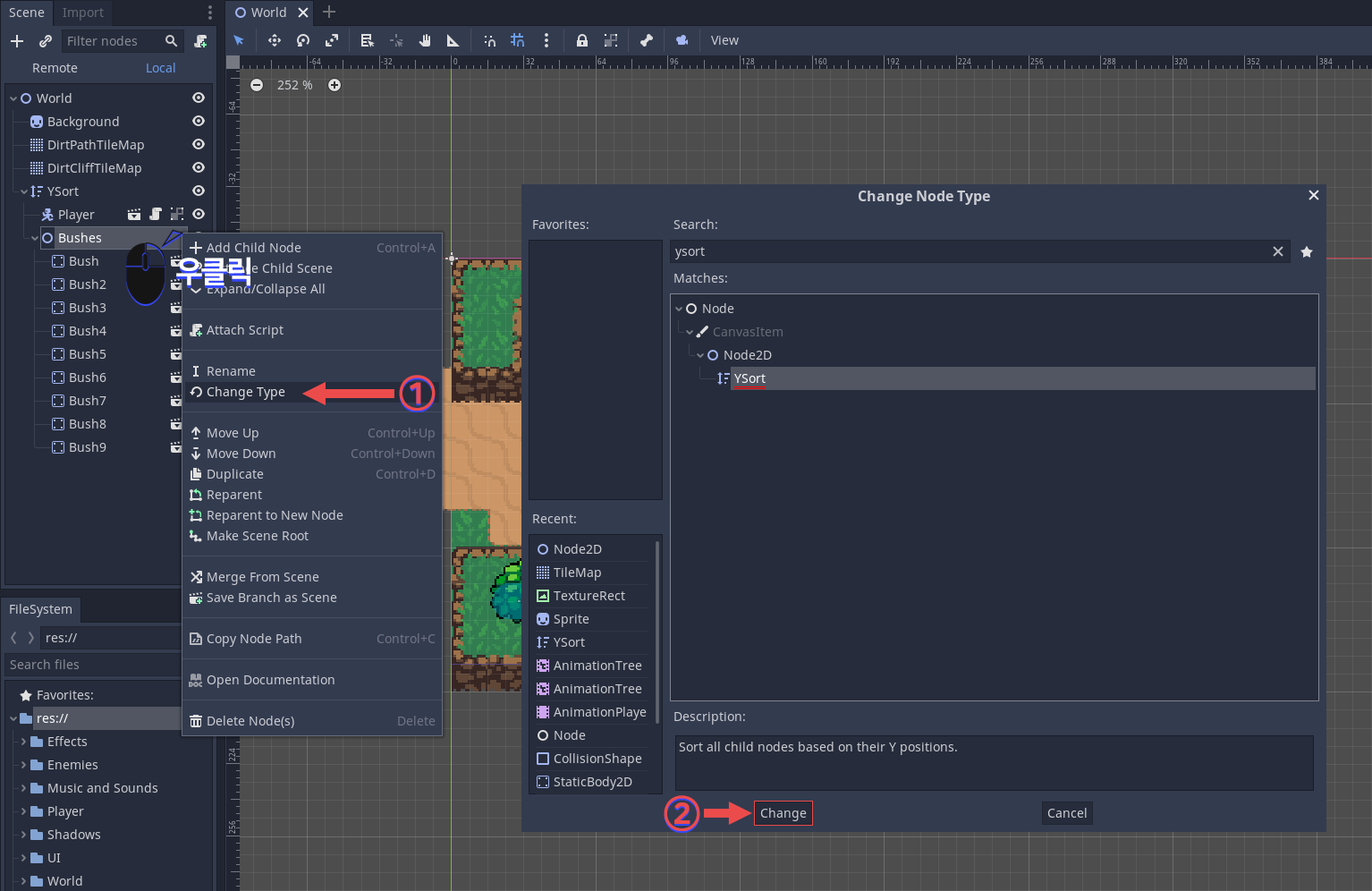 하지만 이 상태로 끝난 것이 아닌데요. 실제로 게임 상에서 보면, Ysort안에 포함되어 있는 자식 노드임에 불구하고