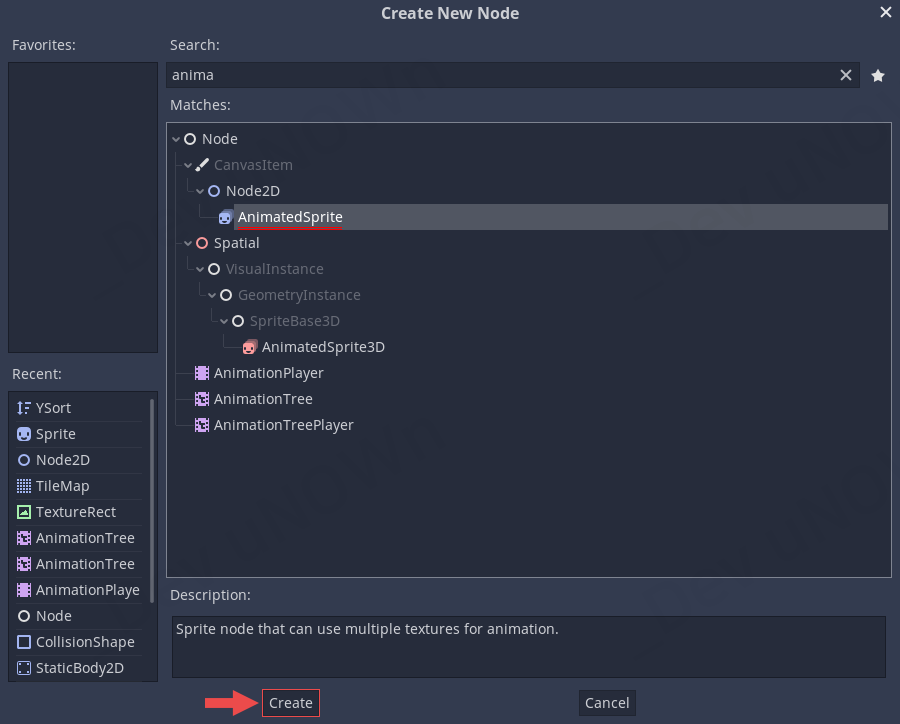 노드를 추가합니다. 'anima'를 검색해서 나오는 AnimatedSprite를 선택하고 생성합니다.
