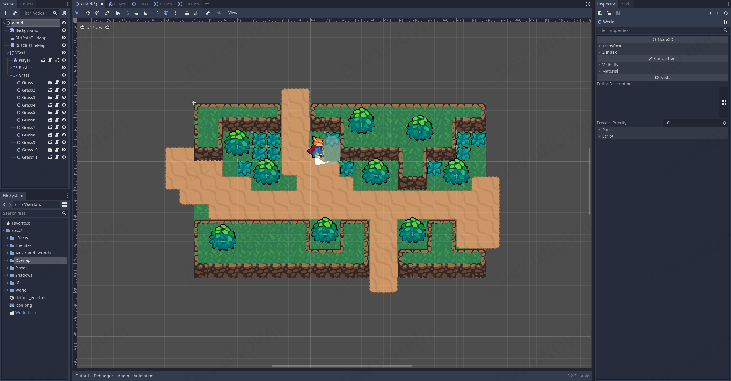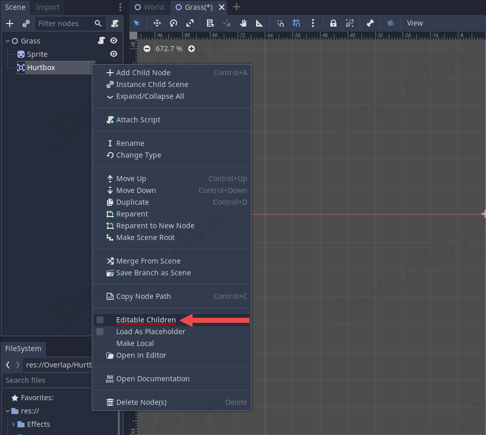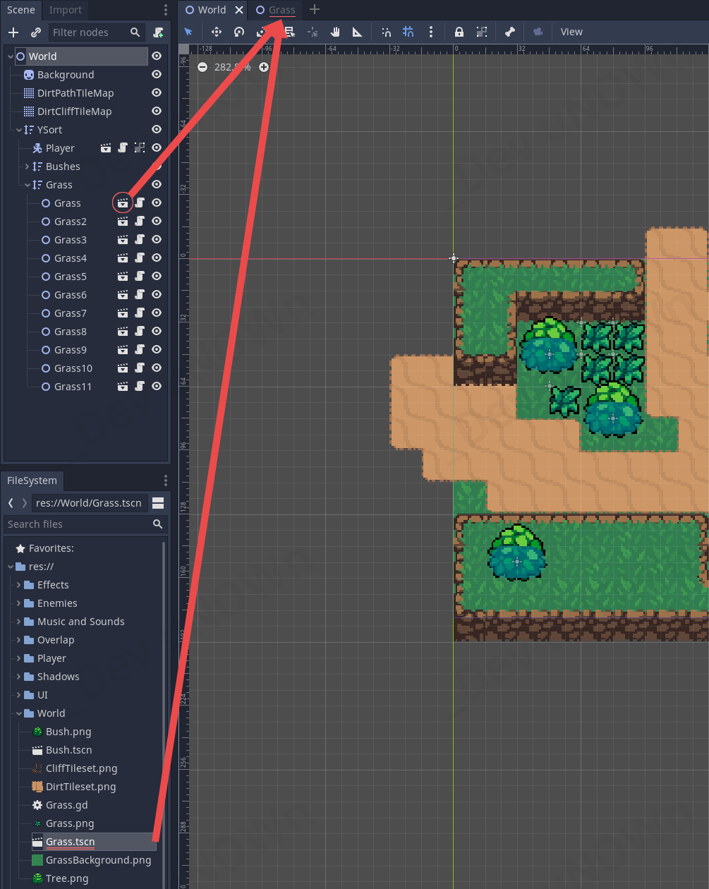 노드에서 씬을 열거나 아니면, 파일 시스템(FileSystem)에서 Grass.tscn를 열어주세요.
