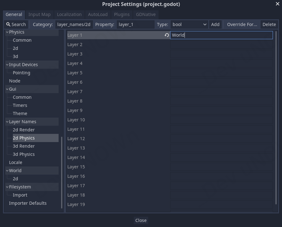 자 이제 사용할 각 레이어에 이름을 지어주면 됩니다. 우선 Layer 1 항목에 'World' 레이어라고 짓도록 하겠습니다.